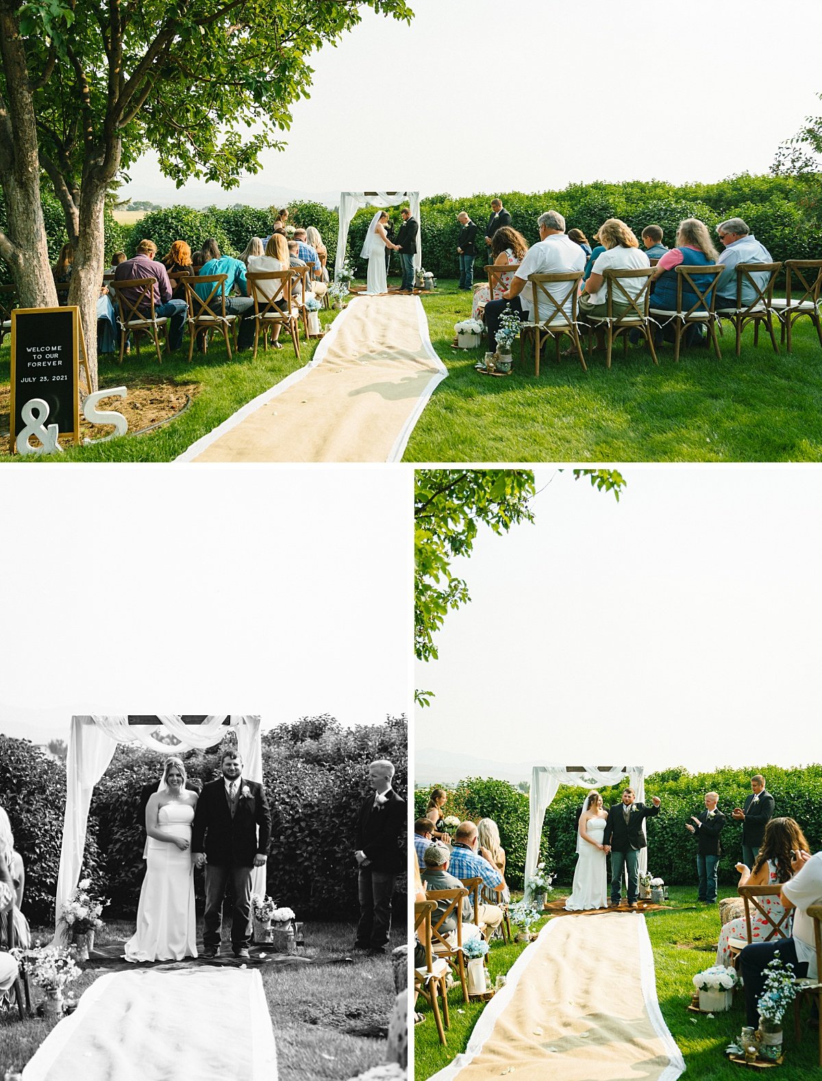 It seemed everyone was ready for a fun, laid-back Wyoming wedding and celebration, so I made my way to the altar located in the garden. The weather was gorgeous, and I could hear birds chirping in the surrounding bushes and trees. Chandler and his entourage began strolling down the aisle, followed by a cowboy boot-wearing flower girl. Shelby rounded the corner and looked enchanting as she came into sight.