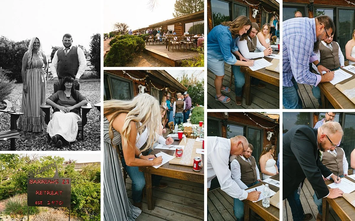 Back at the cabin, it was time for everyone to kick back and settle in. The sun began its descent, and the deck was comfortable and shaded. The wedding reception festivities commenced with the official signing of the marriage documents. I love how the minimalistic décor accentuated the naturally occurring beauty of this Wyoming wedding venue as well as the bride and groom. I couldn't help but think it must be wonderful to meet your soul mate at a young age and even more wonderful to marry your first love.